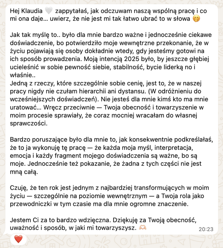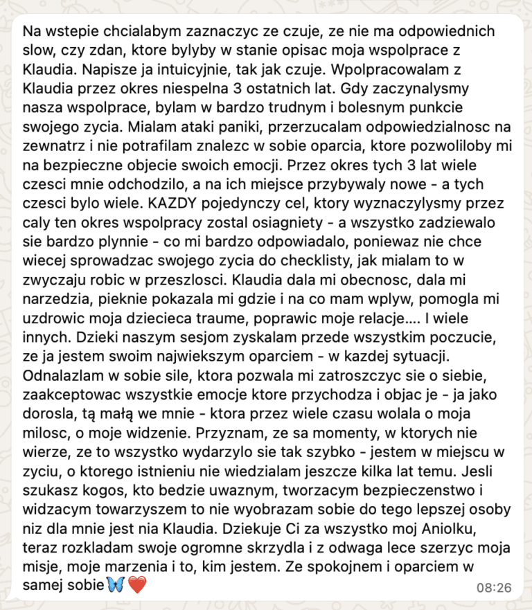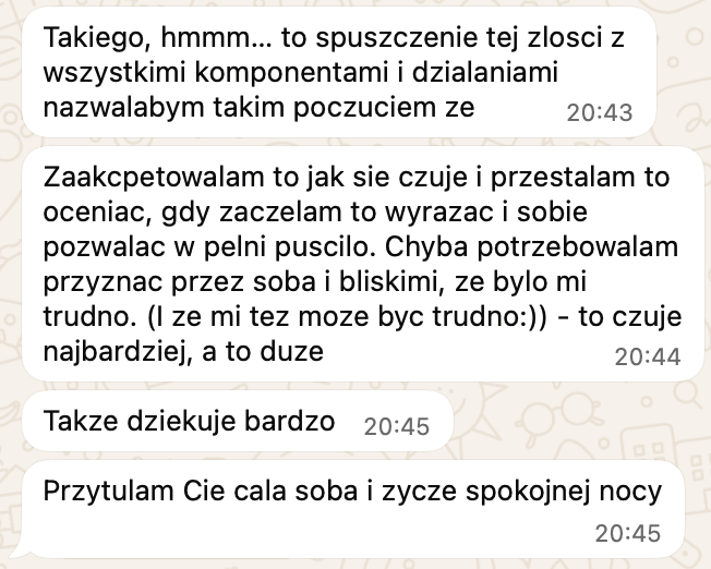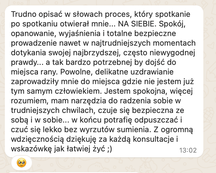 Dostajesz ode mnie wspierające narzędzia, nagrania oraz wsparcie i kontakt pomiędzy sesjami.