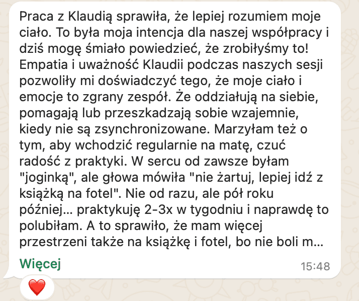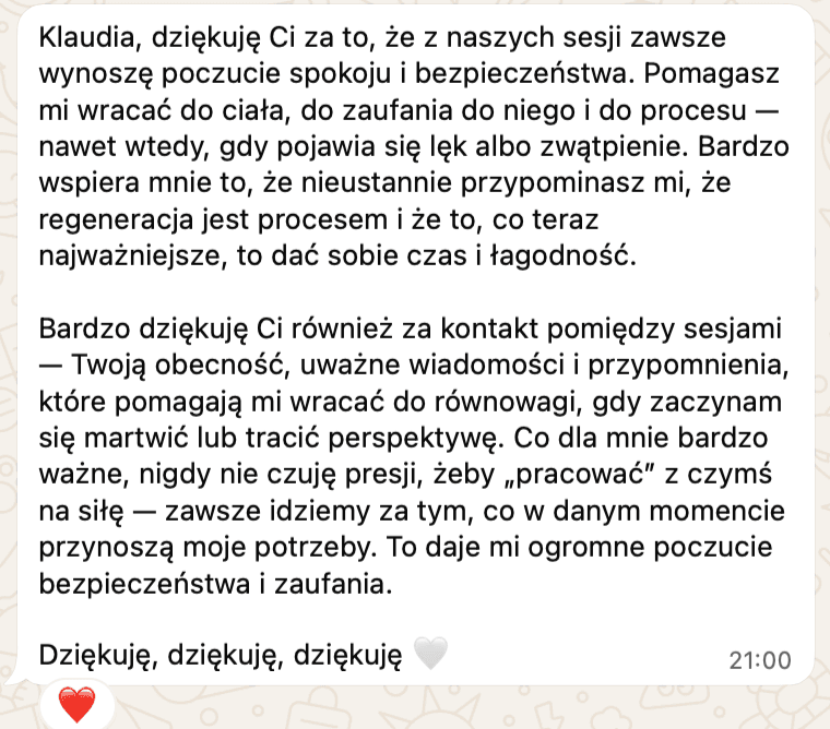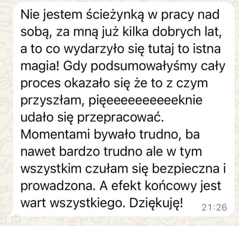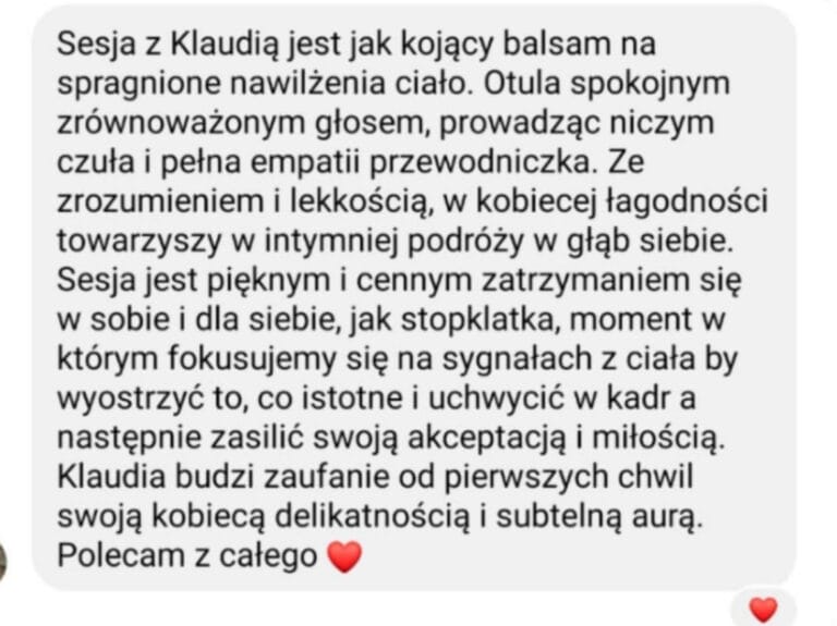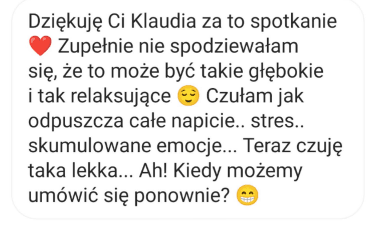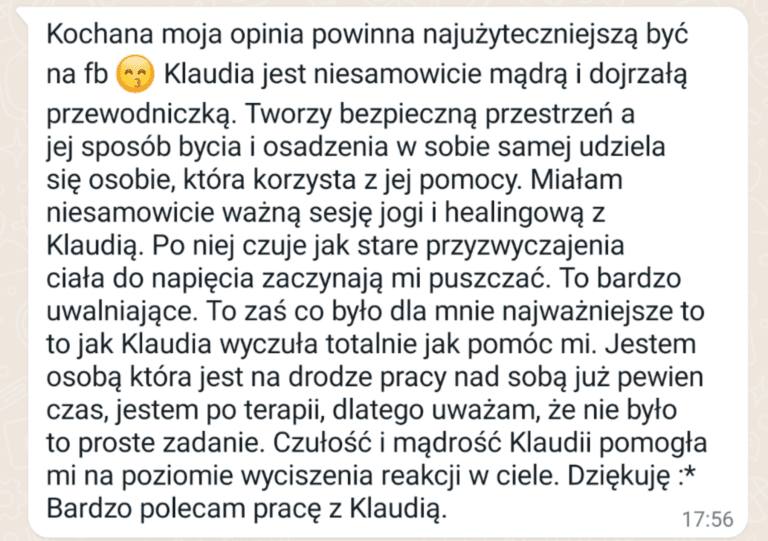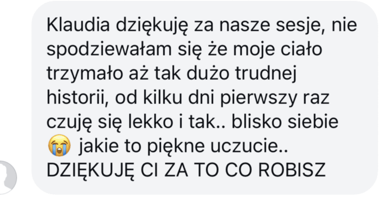 Jestem tutaj, by przypomnieć Ci coś ważnego: Twoje ciało pamięta. Każde napięcie, każdy stres, każda emocja, której nie mogłaś lub nie chciałaś wyrazić, została w nim zapisana. Ale jest w tym dobra wiadomość – skoro Twoje ciało pamięta, to może się też uwolnić. I ja jestem tutaj, by Ci w tym pomóc.